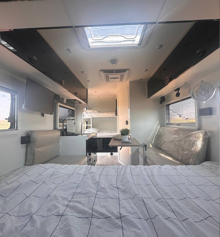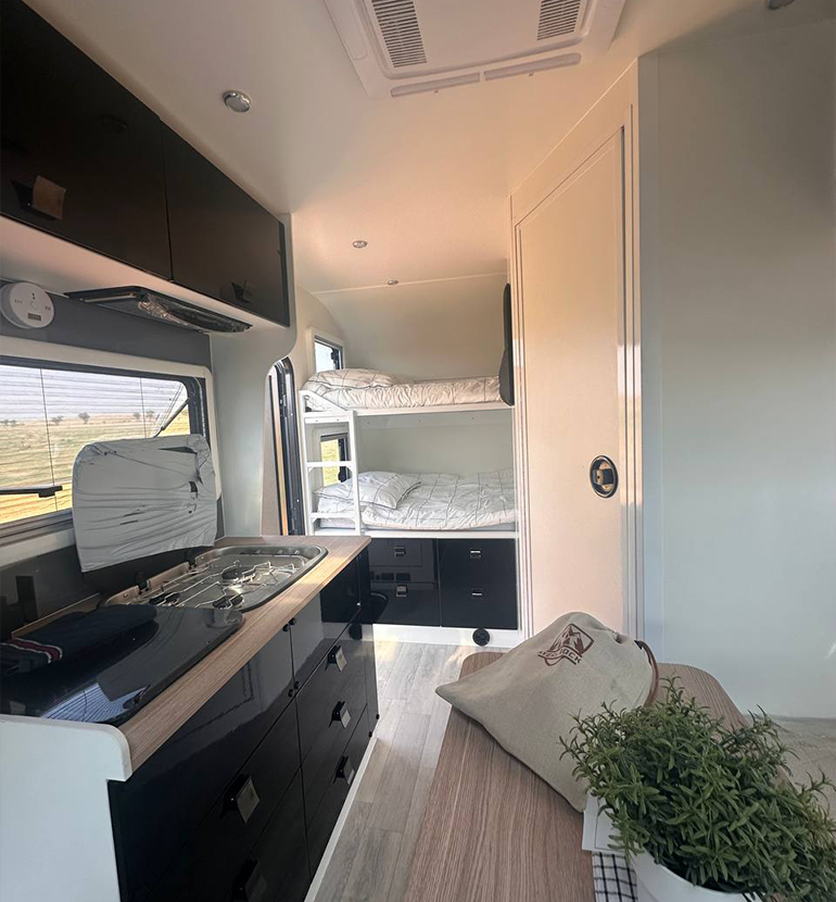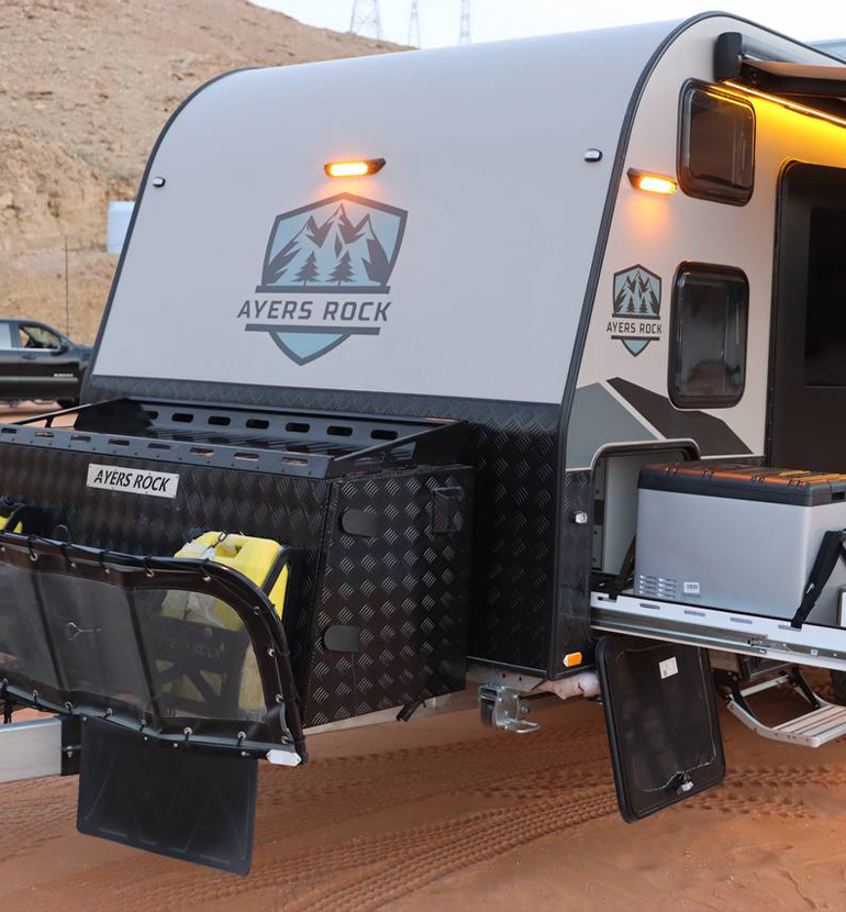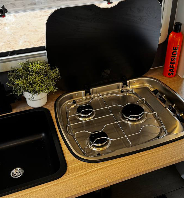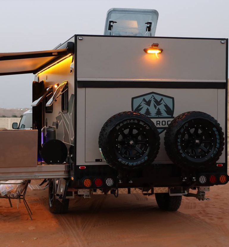Double Bed and Berth: A double bed is also installed in this caravan that can be lifted when not in use and pulled down at night. It is wide enough for two people to sleep comfortably. A sleeping loft is also available when you have additional travelers. Built-in Kitchen: We have installed a mini kitchen in the 13ft Off Road RV which includes a burner to cook, a sink to wash, and cupboards for utensils. Sofas with Table: Super comfortable sofas provide extra space for seating and a table to create a dining space.