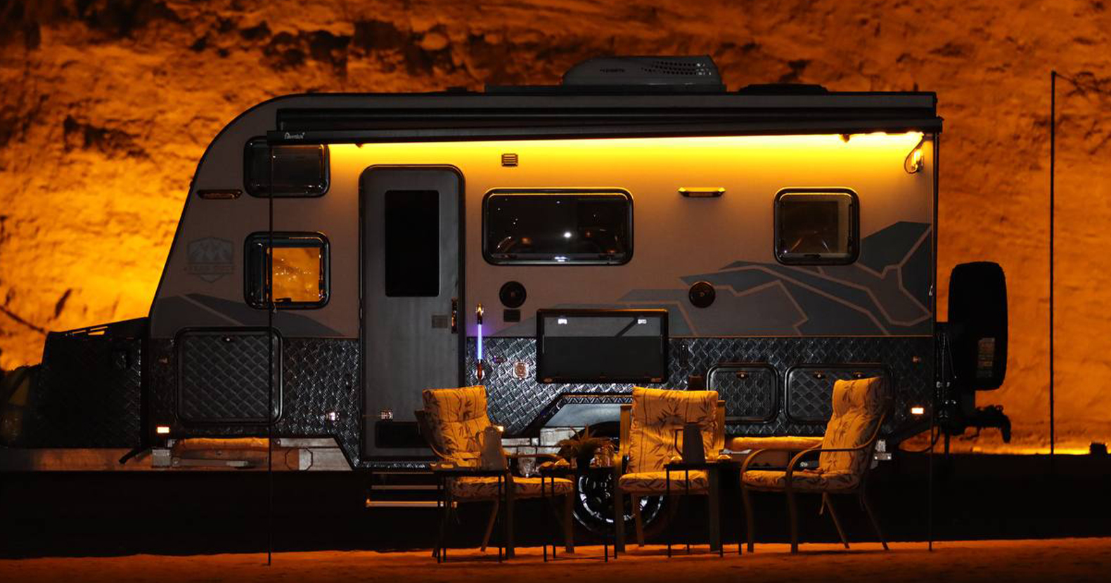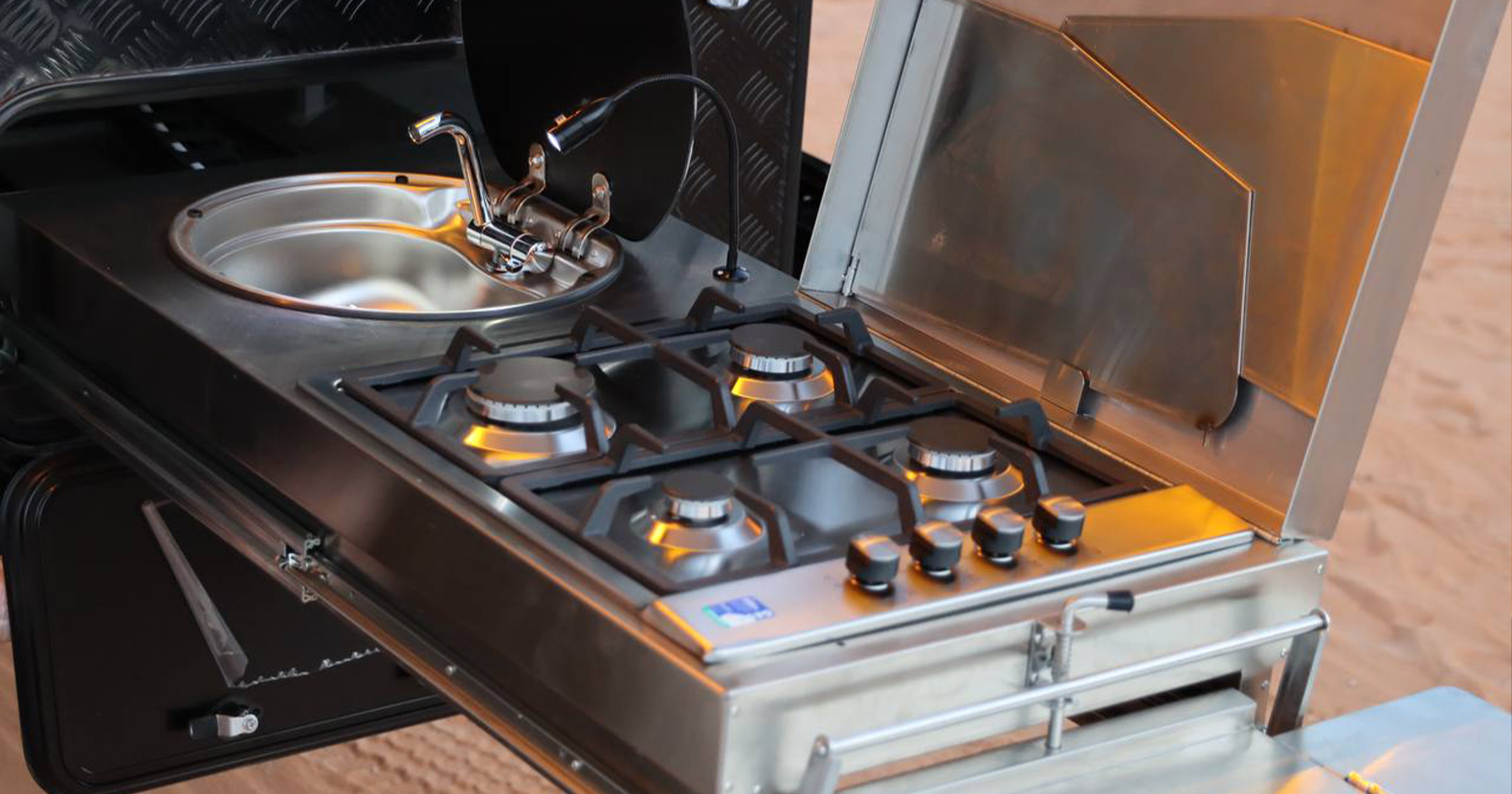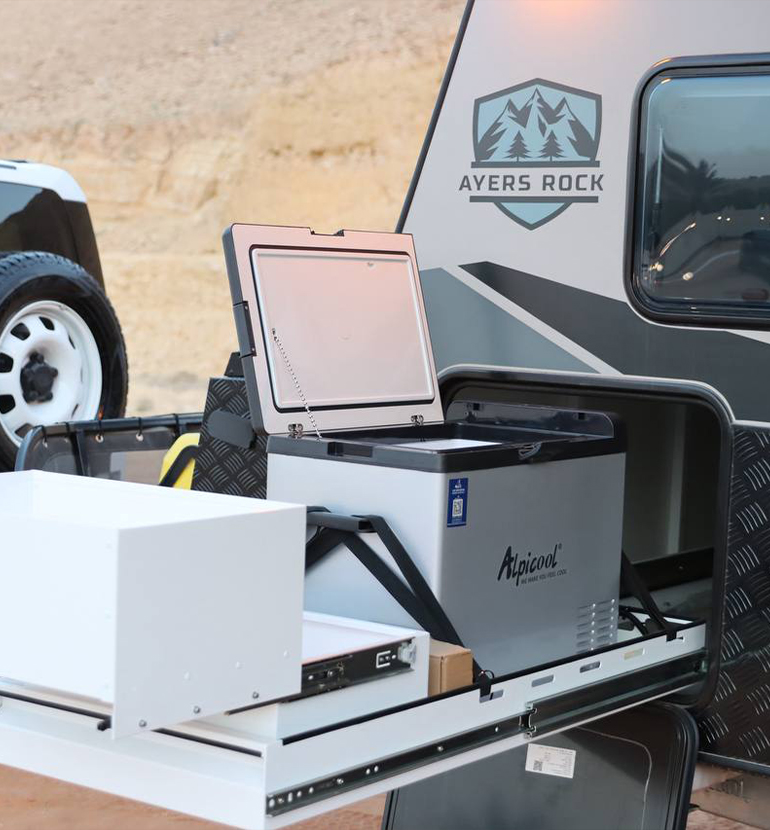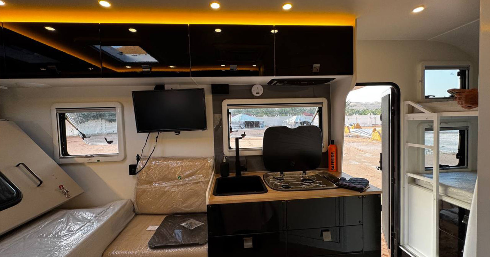 Double Bed and Berth: A double bed is also installed in this caravan that can be lifted when not in use and pulled down at night. It is wide enough for two people to sleep comfortably. A sleeping loft is also available when you have additional travelers. Built-in Kitchen: We have installed a mini kitchen in the 13ft Off Road RV which includes a burner to cook, a sink to wash, and cupboards for utensils. Sofas with Table: Super comfortable sofas provide extra space for seating and a table to create a dining space.