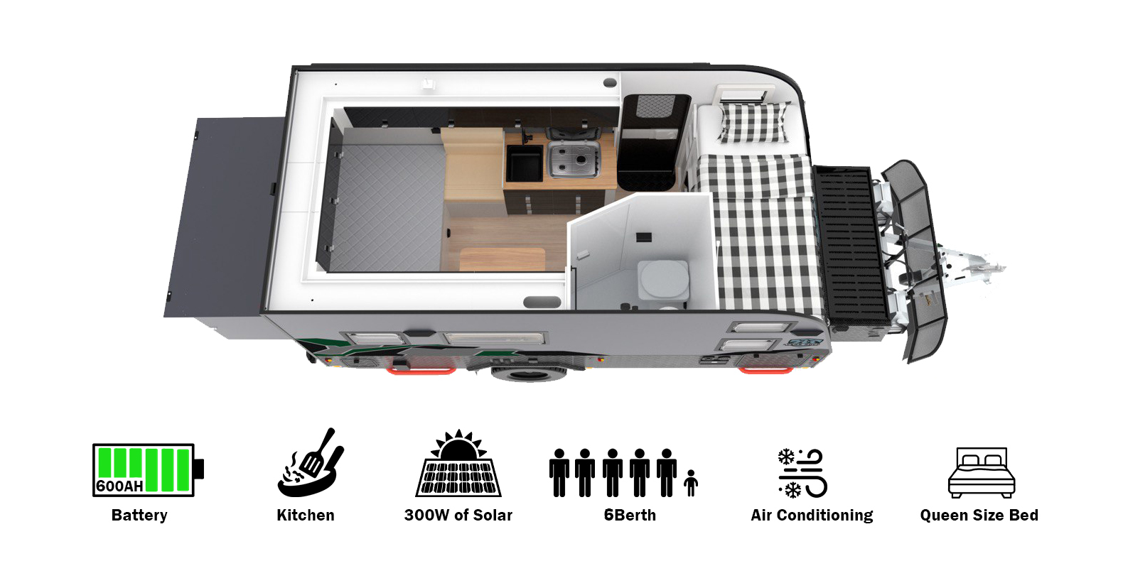 Plumbing Fresh Water Tank & Grey Water Tank Water Heater Water Pump One-piece Bathroom Water Purifier External Shower Box (hot and cold water) External Single Cold Brass Tap 9KG Gas Bottle Holder × 2 All Copper Gas Piping System External Kitchen
